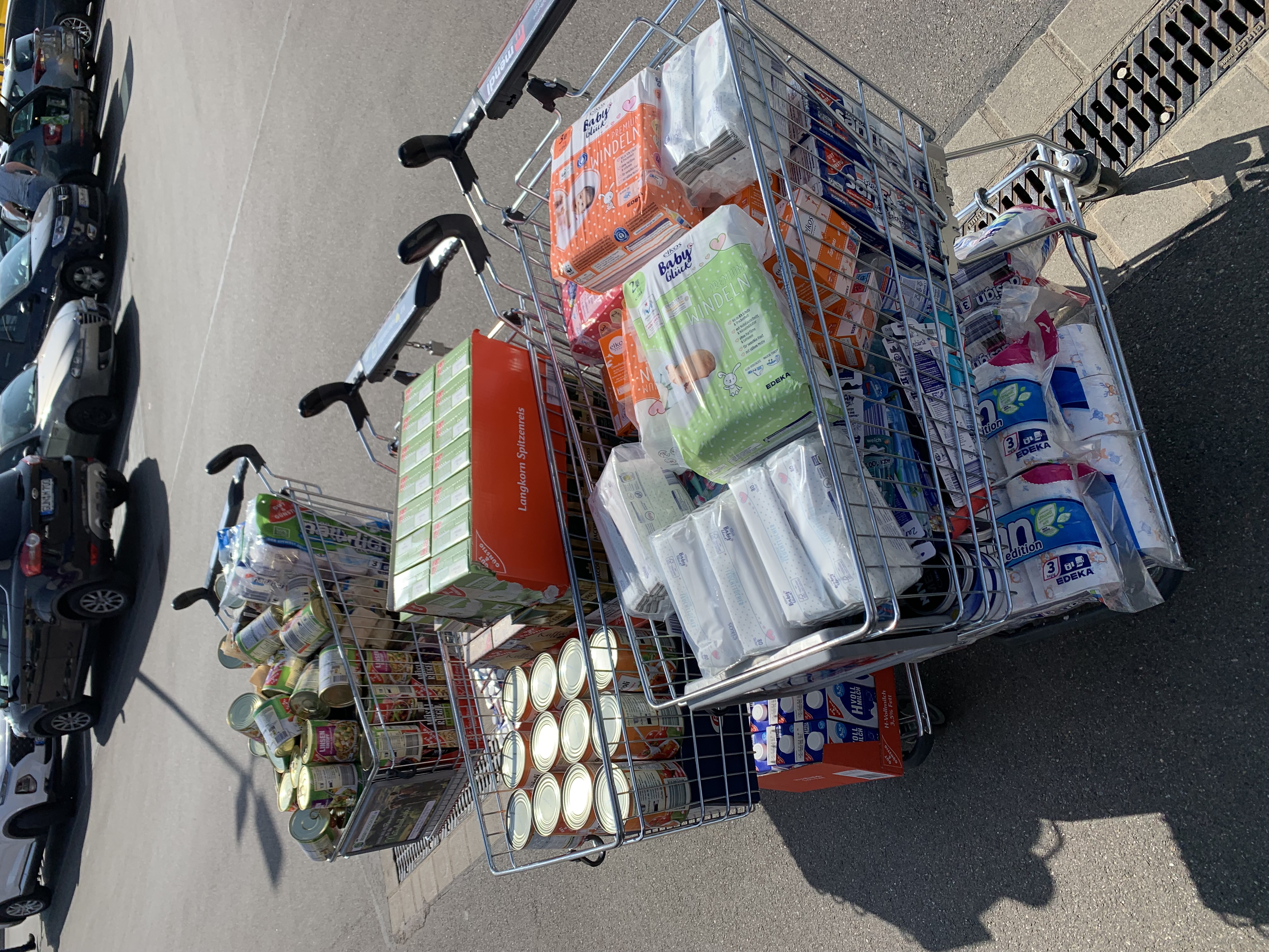 Wir haben einen Großeinkauf gemacht und dringend benötigte Hilfsgüter für die direkte Verteilung an ukrainische Familien in der Umgebung eingekauft. Ein Teil davon wird auch direkt in die Ukraine transportiert.